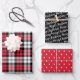 Das rustikale, moderne Geschenkverpackungs-Set verfügt über drei aufeinander abgestimmte Packpapierblätter: kariertes Muster in klassischem Rot, Weiß und Schwarz, Schwarz mit dem weißen Schriftzeichen "Frohe Weihnachten" und Rot mit kleinen weißen Kiefern.