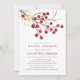 Schöne schicke rustikale Brautdusche Einladung für eine Winterhochzeit. Es gibt rote Waldbeeren auf einem nackten Ast, die mit einer Goldglocke und einem Zwirn dekoriert sind. Brautparty und der Name der Braut sind rot - wie auch die Rückseite des Brautparty einladen. Der übrige Text ist dunkelgrau in einer klassischen Kombination aus aufrechten und kursiven Schriftart.