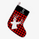 Moderner rustikaler, hellrot und schwarz karierter Büffel karierter Weihnachtsweih-Strumpf mit individualisierbarem Monogramm und Namen mit einer Hirschkopf-Silhouette.