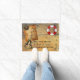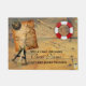Rustikale nautische Türmchen mit verwittertem Holzboden und alten rostigen Nägeln. Oben liegt eine alte Karte, ein Kompass, ein Lebensbewahrer, ein Seil und ein Schiffsmikrometer.