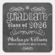 Weiße Graduierungsparty begünstigen Aufkleber mit schwarzem Chalkboard strukturiertem Hintergrund mit handgeschriebenem weißem Kreidetext, Schriftrollen und Doodles "Graduate" mit personalisiertem Text für den Absolventen- und Schulnamen.