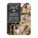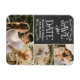Whimsikaler und einzigartiger zweiseitiger Kollage-Ankündigungs-Magnet speichern die Daten mit einem rustikal strukturierten Look Blackboard Hintergrund mit handgeschriebenen Stil Schriftart, die eine weiße Kreide Aussehen. Personalisieren Sie mit den Hochzeitsdetails und drei (3) beliebten Verlobung-Fotos.
