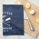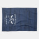 Dieses Küchentuch aus einem Familienhaus mit gekreuzten Rudern und einem springenden Fisch auf marineblarem Holzfußboden, Familienname, Lage des Seehauses und feststehendem Datum als leicht zu personalisierende Vorlagen.