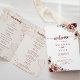 Dieses rustikale Sommerblumen gefaltete Hochzeitsprogramm ist perfekt für eine einfache Hochzeit. Die Blume sind bordeauxrot, rosa und rot, das Wasser ist mit grünen Blätter in einem bräunlichen Hintergrund. Geben Sie ein Angebot oder eine kurze Nachricht, die Reihenfolge des Dienstes, Hochzeitsfeier und Dankeschön Nachricht.