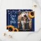 Rustikale Hochzeitskarte mit marineblau und sonnenblütenblauem Foto Save the Date mit Sonnenblumen und Lichtern auf einem Stallholzhintergrund. Ideal für eine marineblaue Hochzeitsfeier, die von Blume mit Sonnenblumen inspiriert wird.