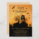 Eine individuell gestaltbare Halloween-Party-Einladung mit einem rustikalen Spuk Haus mit Katzen, Fledermäusen, Grabstein und Eulen und schwarz-weiß Streifen für die Rückseite. Diese Einladung ist perfekt für rustikales Halloween-Party.