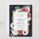 Rustikale Navy Barn Holz Elegant Rot und Gold Floral Weiße Hochzeit Probe Dinner Einladungen. Das Design zeichnet sich durch rote Blume, Anemone und Weiße Blume aus, mit grünem, elegantem, rustikalem Goldrahmen, hinten verziert