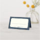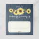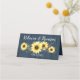 Hübsche Sonnenblumen über blauem Stallholzhintergrund, gefaltete Sitzkarte mit weißem Bereich für das Handschreiben von Namen und Tischnummer und personalisierte Namen und Nachrichten auf der Rückseite.