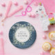 Mit hübschen Saitenlichtern und zarten Aquarellfarben-Blätter auf rustikalem, blauen Holzhintergrund können diese schicken botanischen Brautparty-Papier-Teller mit Ihren speziellen Brautparty-Informationen personalisiert werden. Entwickelt von Thisisnotme©