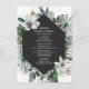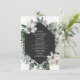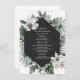 Rustikales Strandthema mit Blätter aus Palmen und weißen Blumen rund um das dunkelgraue geometrische Design.