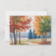 Ein Aquarellbild einer Herbstlandschaft mit einem schmutzigen Weg, der sich durch farbenfrohe Bäume zieht. Die Bäume auf den links haben tiefrote und orangefarbene Blätter, während die Bäume auf der rechten Seite von Gelb zu Grün übergehen. In der Mitte steht ein großer blauer Kiefernbaum. Der Weg ist in warmen Brauntönen gestrichen, die Blätter sind gefallen und orange. Der Hintergrund ist mit sanften Hügeln in gedämpften Blau- und lila Tönen gestaltet. Der Himmel ist in sanft blauen und weißen Wellen gestrichen, was eine friedliche Herbstatmosphäre schafft. Das Gras entlang des Weges wird in verschiedenen Grün- und Goldtönen gerendert. Das Bild hat einen lockeren, ausdrucksstarken Stil, der typisch für Aquarelltechniken ist, mit sichtbaren Pinselstrichen und Farbblutungen. Die Komposition wird mit den Bäumen ausgeglichen, die starke diagonale Linien erzeugen, die vom Vordergrund zum Hintergrund führen. Die Farbpalette besteht aus Rot, Orangen, Gelb, Grüntöne, Blues und Braun, die das Wesen eines Herbsttages einprägen.