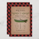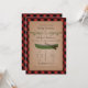 Eine Hochzeitseinladung mit einer Illustration von zwei immergrünen Baumzweigen und einem grünen Kanu. Hintergrund ist rot und schwarz kariert. Personalisieren Sie den Text.