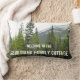 Dieses rustikale KissenAusrüstungsbeschreibungen, die eine kundengerechte Mitteilung mögen, "begrüßen Sie zur Georgiana Familien-Hütte". Der Familienname kann personalisiert sein. Er kennzeichnet auch ein Foto der Bäume des Waldes und des Berges.