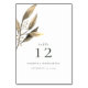 Aquarellfarbenes rustikales Gold und braunes Eukalyptusblatt mit einer Tischnummer aus Gummi-Nuss-Samen. Passen Sie den Text auf der Karte an, um Ihren Anlass Anzug.