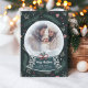 Mit unserer illustrierten Weihnachtsgrußkarte senden Sie uns herzliche Urlaubswünsche. Ihr Foto steht im Zentrum der Bühne in einer zauberhaften Schneekugel, die mit verzierten Schnörkeln geschmückt ist, Set vor einem dunklen aquamarinen Hintergrund. Das festliche Design umfasst Schneeflocken, ein "Frohe Weihnachten"-Skript und ein Weihnachtsblumenmuster auf einem bearbeitbaren dunkelgrünen Hintergrund. Mit dieser eleganten und individuell gestaltbaren Urlaubskarte können Sie die Saison genießen.