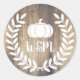 Rustikale, weiße Farmhäuser Lorbeeren Silhouette über einen hellen Holzboden mit weißen Paarinitialen und niedliche Kürbiskugel Silhouette.