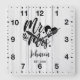 Rustikales Weißes Holz Elegante Script Mr & Mrs. Quadratische Wanduhr