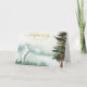 Typografischer Weihnachtsgrüß "Comfort & Joy" in Gold mit einer schönen, scheußlichen, wasserfarbenen Bergszene mit einem aufziehenden weißen Pferd. Pferd auf dem links, mit Nebel im Hintergrund und einem großen Kiefernbaum auf der rechten Seite.