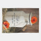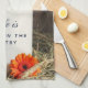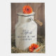 Ein Küchenhandtuch mit rustikalem Thema. Ein Foto von einem Weißmilchkrug und ein paar orangefarbene Blume, die um die Milchdose gelegt werden. Sitzen in einer Scheune auf etwas Heu. Holzpaneele im Hintergrund. Text sagt: "Das Leben ist besser im Land.