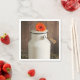 Papierservietten mit rustikalem Thema. Ein Weißmilchkrug und ein paar orangefarbene Blume, die um die Milchdose herum aufgestellt sind. Sitzen in einer Scheune auf etwas Heu. Holzpaneele im Hintergrund.