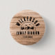 Rustikaler, moderner Familienname-Button mit einem trendigen Wiedersehen-Design aus Waldgebirgen mit Kiefern, Wäldern und Vögeln, umgeben von Ihrem eigenen Familiennamen, einem personalisierbaren Namen Ihrer Feier, sowie dem Datum der Ansammlung.