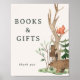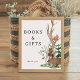 Waldthemen-Babyshower-Bücher und Geschenke-Plakat mit rustikalem Winterwald- und Tierdesign.