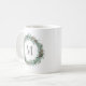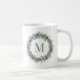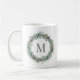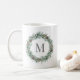 Elegante, individuelle Familienferien Kaffee-Tasse-Design bietet einen rustikalen Chic Kranz der Winterwasserfarbe Grün Rahmen ein ersten oder letzten Namen monogram. Personalisieren Sie mit Ihrer Wahl von Holzkohle graue Buchstaben. Auf der Vorder- und Rückseite der Tasse erscheint ein zweiseitiges Design.