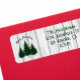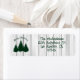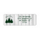 Rustikales Ferienlabel mit grauem Holzboden und dunkelgrünen Bäumen.