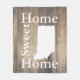 Hölzerne Planken der eleganten und warmen hellen Scheune mit den Wörtern "Zuhause-süßes Zuhause" im Weiß neben einer weißen Silhouette von Indiana!