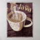 Wärmen Sie Ihre Wand mit diesem Poster eines Vintagen rustikalen Kunstwerks von einer dampfenden Tasse Kaffee im Erdton, Kaffeefarben mit dem Text " Java ".