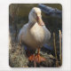 Eine Fotografie einer Sachsen-Ente, die den Rand des Teichs bereitsteht und entlang der Kamera anstarrt.