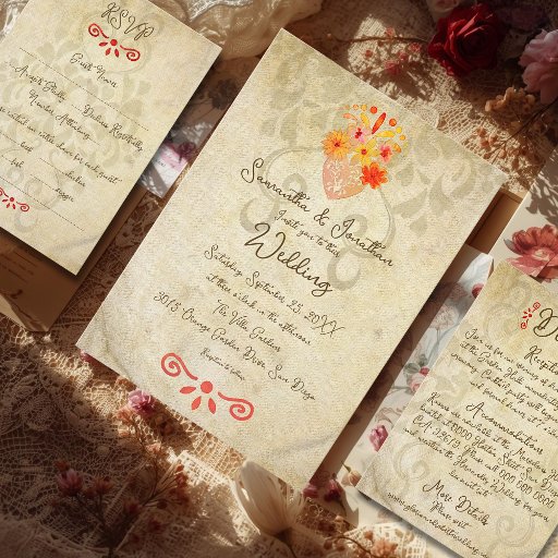 The Sacred Heart Baroque Vintage Mexican Wedding design beautifully captures the warmth and soul of traditional Mexican artistry through a hand-painted sacred heart adorned with watercolor florals in radiant orange, coral, and sunflower hues. Set against a softly aged parchment background, this wedding invitation combines vintage charm with devotional elegance, inspired by Mexican folk art and classical Baroque motifs. Perfect for a wedding invitation, save-the-date card, or thank-you note, this design embodies romance, heritage, and authenticity.