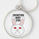 Dieser Schlüsselanhänger zeigt das traurige Gesicht eines weißen Kaninchens. Dieses Kaninchen hat einen großen Frosch auf dem Gesicht, weil es ein Labrador-Kaninchen ist, auf dem Kosmetika getestet wurden. Die weißen Augen sind rot und geschwollen. Das Design wurde entwickelt, um das unnötige Leid, das durch die Untersuchung von Kosmetika an Tieren entsteht, in den Blick zu rücken. Der schwarze Text zwischen den Ohren des Hasen sagt: "Vivisektion muss aufhören"