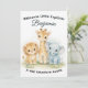 Playful safari animals in soft watercolor whimsical realism style featuring lion elephant giraffe with dusty blue and sage tones, clean layout and friendly expressions for a charming baby boy celebration