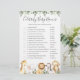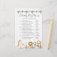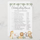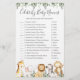 Safari-Tiere themed Baby Dusche Berühmtheit Baby-Namen-Spielkarte bietet eine Aquarell Safari Tier Illustration und Aquarell Grüne eucalyptus Garland und elegante handgeschriebene Stil Schriftart.