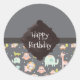 Whimsikale "Happy Birthday"-Aufkleber mit einem Muster aus einer Sammlung niedlicher Wildtiere im Kinderzimmer-Art-Stil - einschließlich Alligatoren, Affen, Vögel, Schildkröten, Giraffen, Elefanten und Löwen alle in Pastellfarben gezeichnet. Set auf braunem Hintergrund. Die Mitte hat einen braunen, rautenförmigen Rahmen, der mit Aquarellen und dem Text "Happy Birthday" innen besteht.