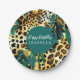 Safari-inspiriert Teller mit Tierfellmustern, dunkelgrünen Palmmotiven und Akzenten brauner Flecken und schwarzer Flecken - perfekt für besondere WILD-Party.