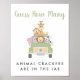 Niedliches Spielzeichen für Ihre Babydusche mit "Guess How many Animal Crackers Are In The Jar" in einer Mischung aus lustiger Dschungelgrün-Schrift und schlichter grauer Typografie und einer Aquarellbilder von Tierbabys (Löwe, Elefant, Zebra, Affe und Giraffe), die in ein Safari-Fahrzeug gepackt werden. Legen Sie ein Glas oder eine Flasche mit Tierknackern darunter und frag Ihren Gästen, zu erraten, wie viele sich im Glas befinden. Der Gewinner wird der Gast sein, der am nächsten wird, ohne übergehen zu müssen. In unserer Süße Tier Safari Baby Shower Collection finden Sie passende Ratenkarten.