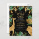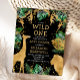 Die Babydusche zum Thema "Wilder-Dschungel-Safari" lädt mit goldenen Imitaten (Giraffen, Löwen und Affen), goldenem und grünem Dschungelblättern und einer Sprinklerei Goldkonfetti auf schwarzem Hintergrund zum Verweilen ein. Fügen Sie den Namen der Mutter-zu-sein und Dusche Details in weiß und gold Text.