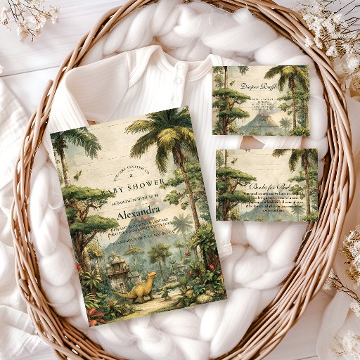 Step into a lush prehistoric paradise with this vintage-style dinosaur design. Featuring palm trees, ferns, and gentle dinosaurs in warm earthy tones, it’s perfect for a baby shower with adventure and charm. A timeless blend of tropical greenery and whimsical Jurassic nostalgia.