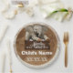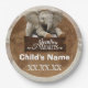 Personalisierte Abenteuer-Erstgeburtstagspapierplatten mit Safari-Elefanten, vintage alter Weltkarten-Hintergrund und rustikalem Holzschild-Design mit dem Namen und dem Geburtsdatum des Kindes schaffen eine unvergessliche Explorer-Party.
