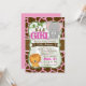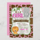 Es ist ein Mädchen! Niedliche Mädchen Elefant und Löwe, Dschungel, Safari, Zoo-Tier Mädchen Dusche Einladung auf pastellrosa und braun giraffe Printmuster mit grüner Weinrebe, Blätter. Ideal für Dschungel-, Zoo- oder Safari-Babyduschen. Vintage Klammer in Form einladen. Die Farben sind pastellrosa, braun, grün, grau und weiß.