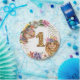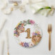 Die niedlichsten Illustrationen eines Babyaffen, der um die Seite dieser Platte schaut, und eines ebenso niedlichen Baby-Löwen-Cubs, der Sie ansieht, haben hübsche Blumenkopftiaras und sind Set vor einem dunkelweißen Hintergrund mit rosa, lila-weiße Blume Set zwischen Grün und Blattwerk. In der Mitte erscheint eine große Giraffe-Ziffer. Diese sind ideal für einen kleinen Jungen oder ein Mädchen, der sein erstes Party zum ersten Mal feiert. Wow Ihre Gäste mit diesem Picknick-Accessoire für Safari, Zoo, Dschungel oder afrikanische Abenteuer themed Party.