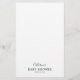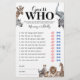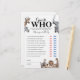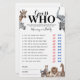 Ein modernes, wildes Baby-Duschspiel mit schlichtem, weißem Hintergrund, eleganten Safari-Tieren (Giraffe, Elefant, Löwe, Zebra, Leopard, Affe, Bienenfresser, Nashörner) und einer leicht zu personalisierenden "raten wer, mommy oder daddy" Vorlage.