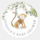 Personalisierte Babydusche-Liebesaufkleber sind mit einer süßen Aquarellillustrierung eines Affen versehen, die oben große Eukalyptus-Blätter und tropisches Dschungelgrün aufweist. Entworfen, um unsere Wild One Baby Dusche Kollektion zu ergänzen.