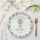 Safari thematisierte geschlechtsneutrale oder Baby-Boy-Duschpapier-Teller, die den grünen Aquarellluftballon mit niedlichen Safari-Tieren zeigen: Elefant, Giraffe, Löwe, Affe und Zebra umgeben von grünen Blätter mit der Nachricht oben: "Adventure Awarits".
