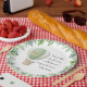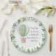 Safari themed gender neutral or baby boy shower paper plates showcasing green watercolor hot air balloon with cute Safari animals: elephant, giraffe, lion, monkey and zebra surrounded by greenery leaves with thank you message on the side.