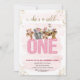 Mädchen wilde eine Safari Thema Geburtstagseinladung. Dieses Design ist hell und kühn und hat die niedlichen Safari Dschungel Babys Tiere, mit herrlichen tropischen Blume, rosa Aquarellstrümpfe und Spritzer von Goldstaub ist sicher, Set für eine bunte Safari-Thema Mädchen Geburtstagsparty.
