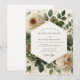 Embrace classic elegance with this stunning botanical composition. Soft, creamy white dahlias and delicate blossoms bloom amidst a lush tapestry of sage green leaves. The detailed, painterly quality of the artwork creates a romantic and sophisticated atmosphere for your nuptials. This design is perfect for a timeless, nature-inspired union.