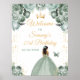 Dieses elegante und glamouröse Geburtstagsparty-Begrüßungszeichen besticht durch eine schöne Prinzessin mit dunkler Haut in einem schlauen, grünen Ball-Gown. Der Text kombiniert handgeschriebene Skripte mit modernen serifenlosen Schriftart für ein elegantes und raffiniertes Aussehen. Die Blumenarrangements, Schmetterling und Goldkonfetti bilden die perfekte Mischung aus rustikal und schick. Grafiken von www.etsy.com/uk/shop/SunflowerDayLove